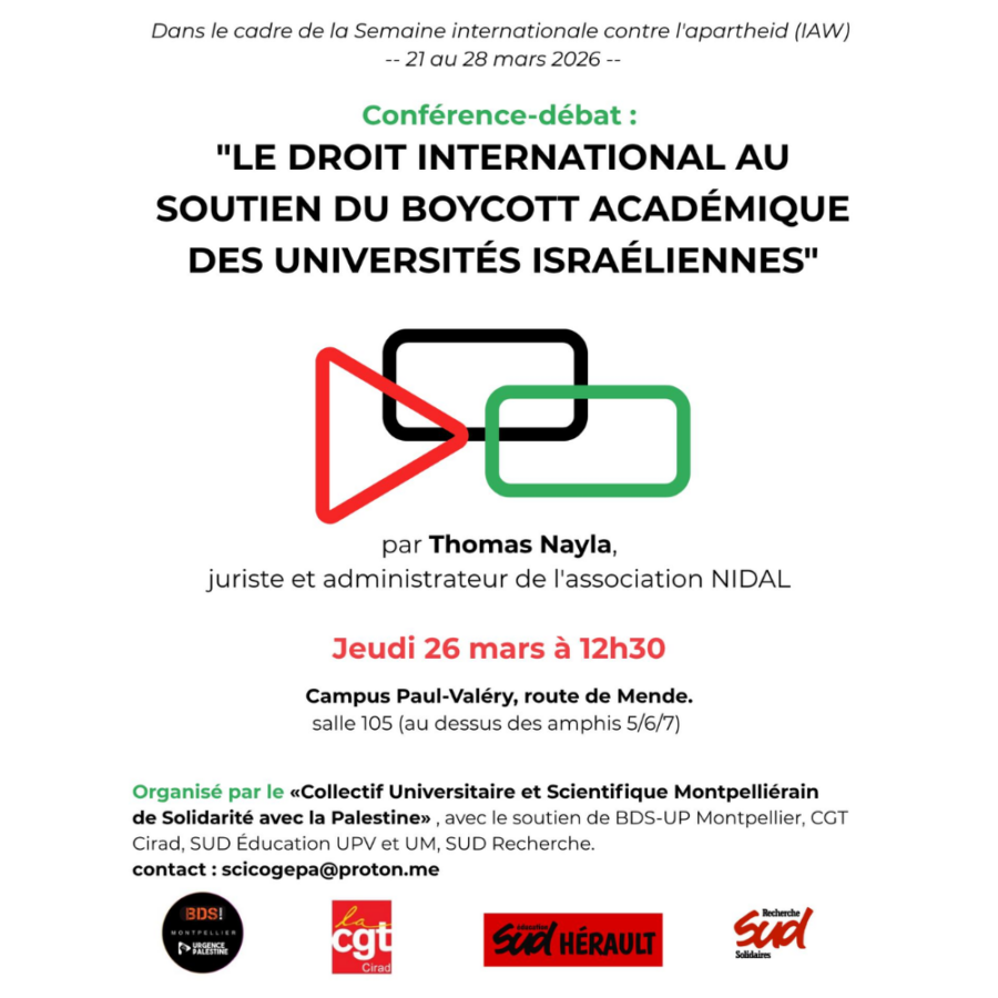 Lire la suite« Le droit international au soutien du Boycott académique des universités israéliennes » Jeudi 26 mars 2026 à 12h30 – Salle 105 Université Paul Valéry