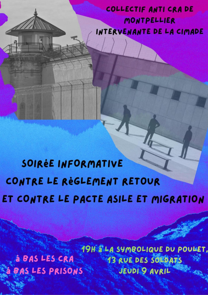 Les négociations entre Commission Européenne, Conseil européen et Parlement européen vont s’ouvrir. C’est maintenant qu’il faut nous mobiliser, avant que ce texte ne devienne définitif ! Pour en savoir plus et se mobiliser, rendez-vous jeudi 9 avril à partir de 19h à la librairie la Symbolique du Poulet (13 rue des soldats) pour une soirée informative contre le règlement retour et contre le pacte asile et immigration organisée par le collectif anti-CRA de Montpellier en compagnie d’intervenant-e-s de la Cimade !