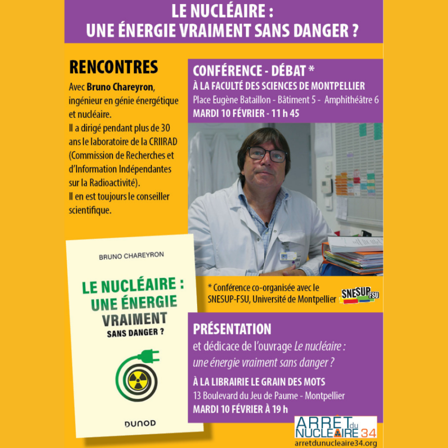 Lire la suiteLe nucléaire est-il vraiment sans danger ? Conférence le 10 février à 11h45 FDS Amphi 5.06 avec Bruno Chareyron à Montpellier