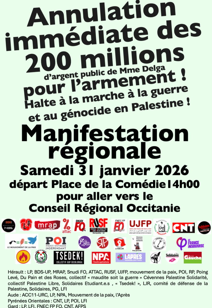 Le Réseau Universités Sans Frontières 34 appel à rejoindre le rassemblement unitaire du Samedi 31/01 14h Place de la Comédie pour rejoindre le Conseil régional d’Occitanie à 15h30 pour l’annulation immédiate des 200 millions d’euros pour l’armement.